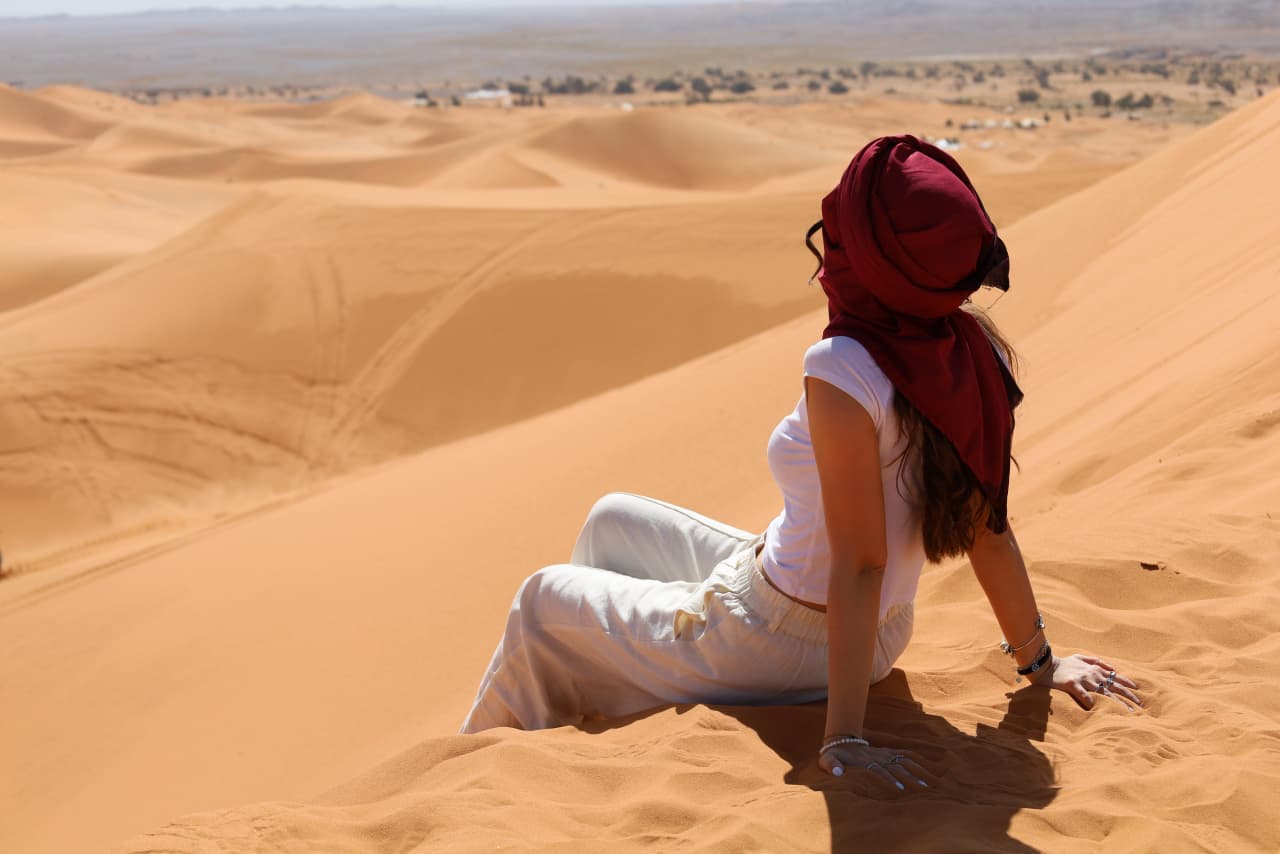 After breakfast, journey along the legendary Road of a Thousand Kasbahs, passing through traditional Berber villages, lush oases, and scenic landscapes. Stop at the breathtaking Todra Gorge, a canyon with sheer cliffs rising hundreds of meters, perfect for a walk or photography. Continue to Erfoud, famous for its fossil-rich terrain, and Rissani, a historic center of Saharan trade. Arrive in Merzouga, where camels await to take you on a sunset trek across the golden Erg Chebbi dunes. Reach your luxury desert camp, where a warm Berber welcome awaits with a traditional dinner, music, and a magical night under the star-studded Sahara sky.